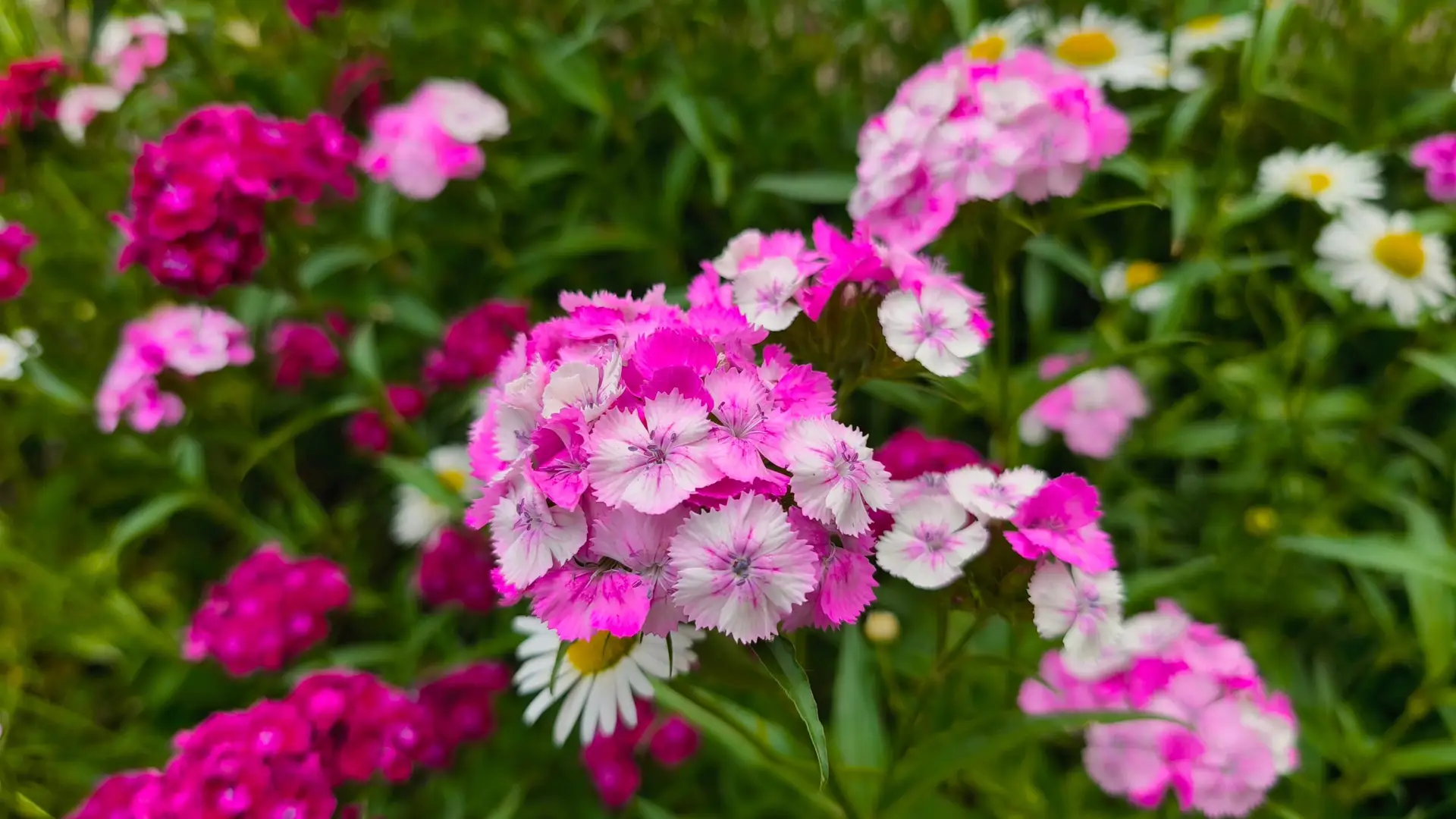 Pink und weiß blühende Bartnelken im Gartenbeet mit grünen Blättern.