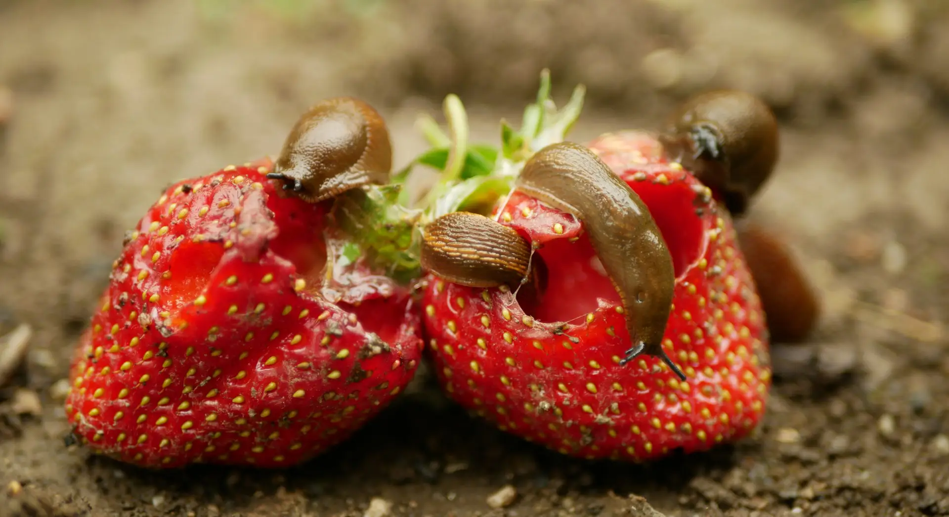 Mehrere Nacktschnecken fressen an reifen Erdbeeren und zeigen einen typischen Schädling im Gartenbeet.
