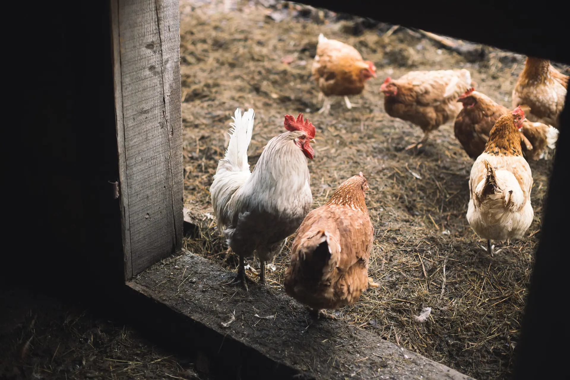 Hühner und ein weißer Hahn stehen im offenen Hühnerstall auf Stroh.