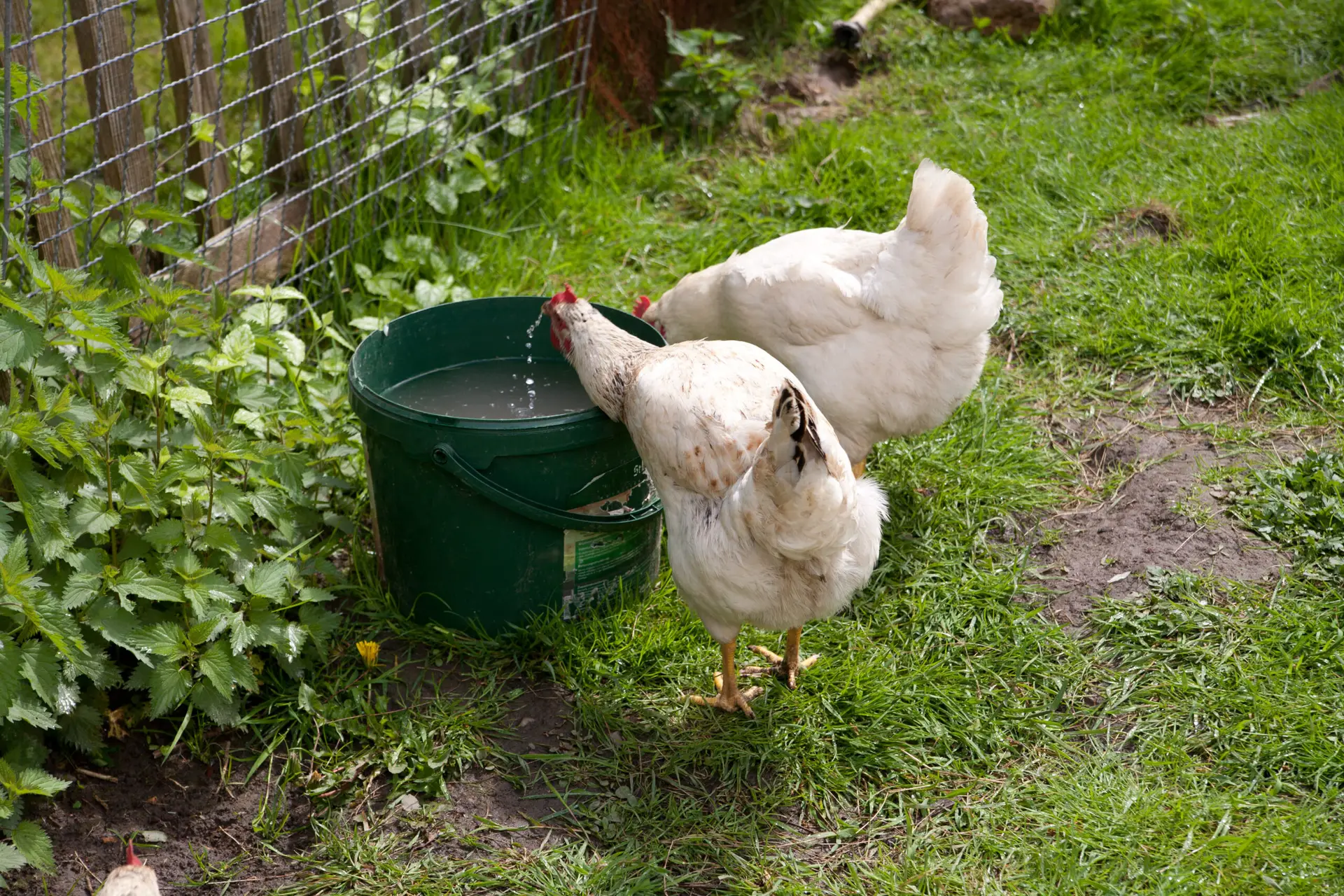 Frisches Trinkwasser im Auslauf ist wichtig für gesunde und vitale Hühner im Garten.