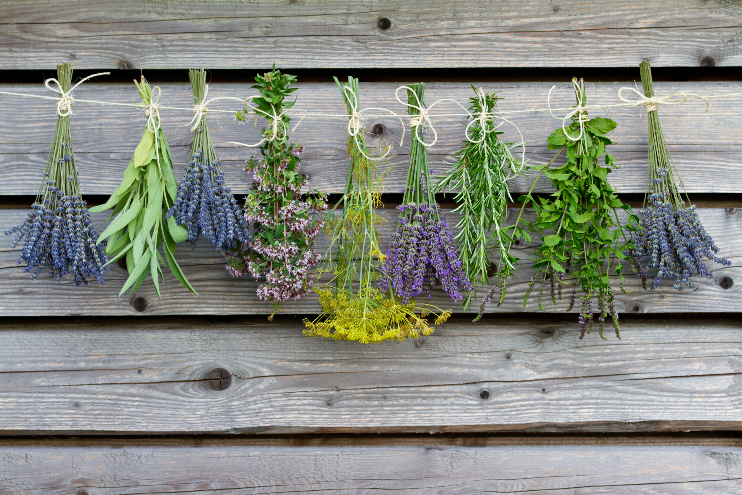 3. Trocknen: Binde kleine Bündel und hänge sie kopfüber an einem dunklen, luftigen Ort. Alternativ kannst du sie auf einem Trockensieb ausbreiten.